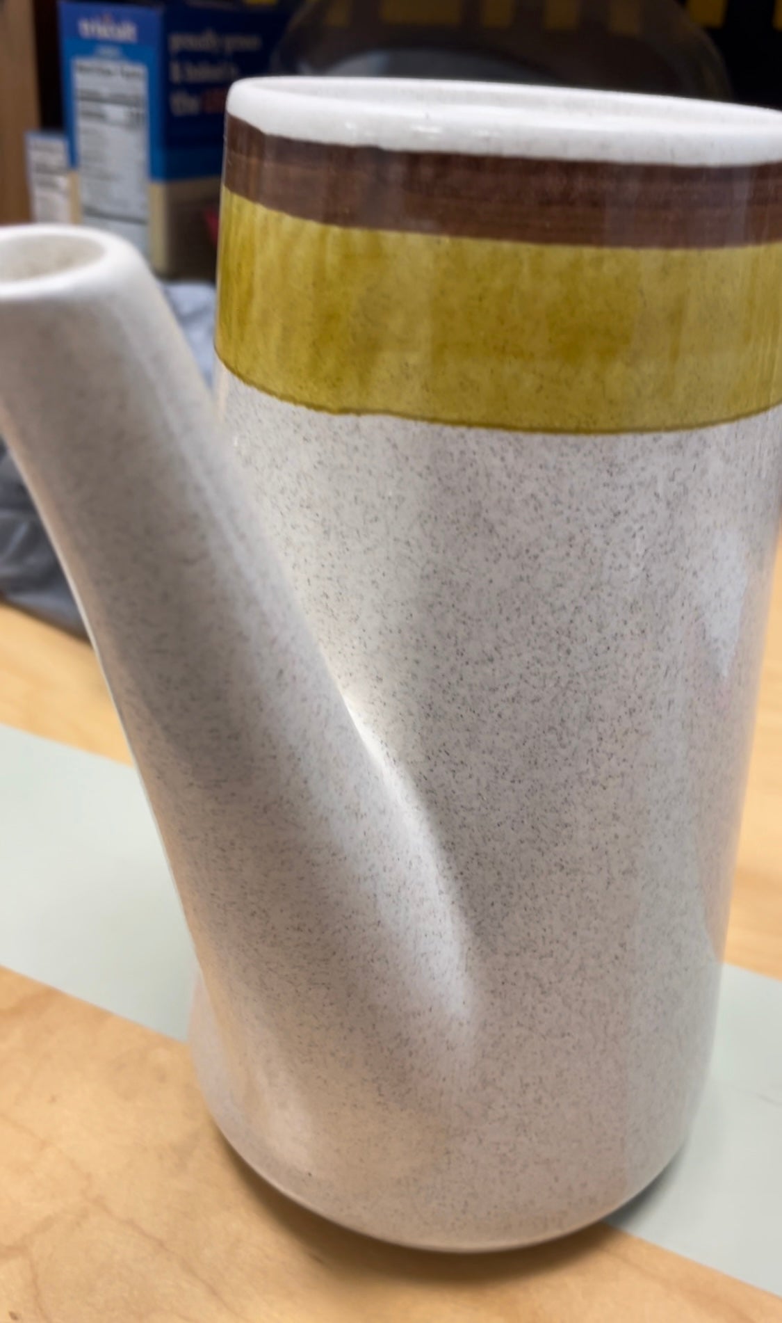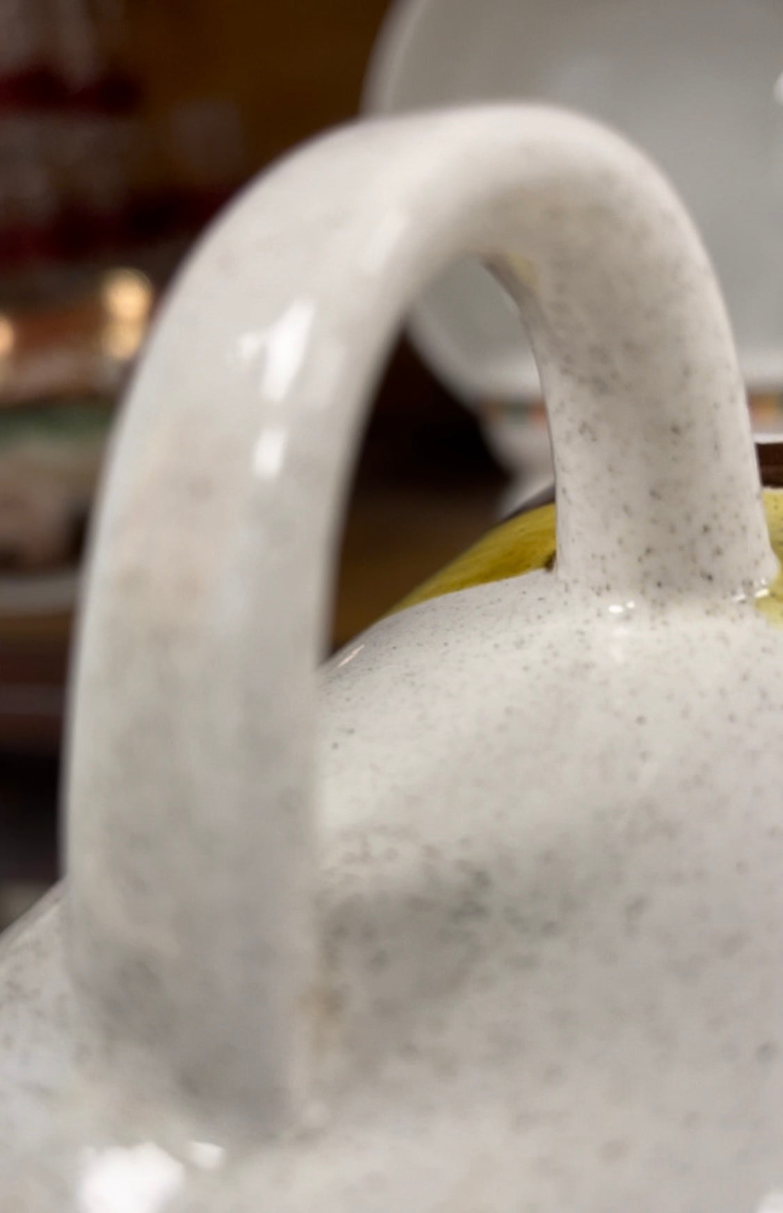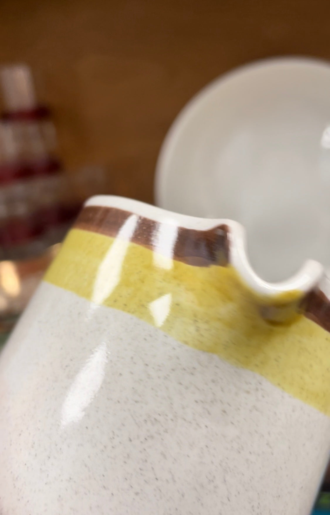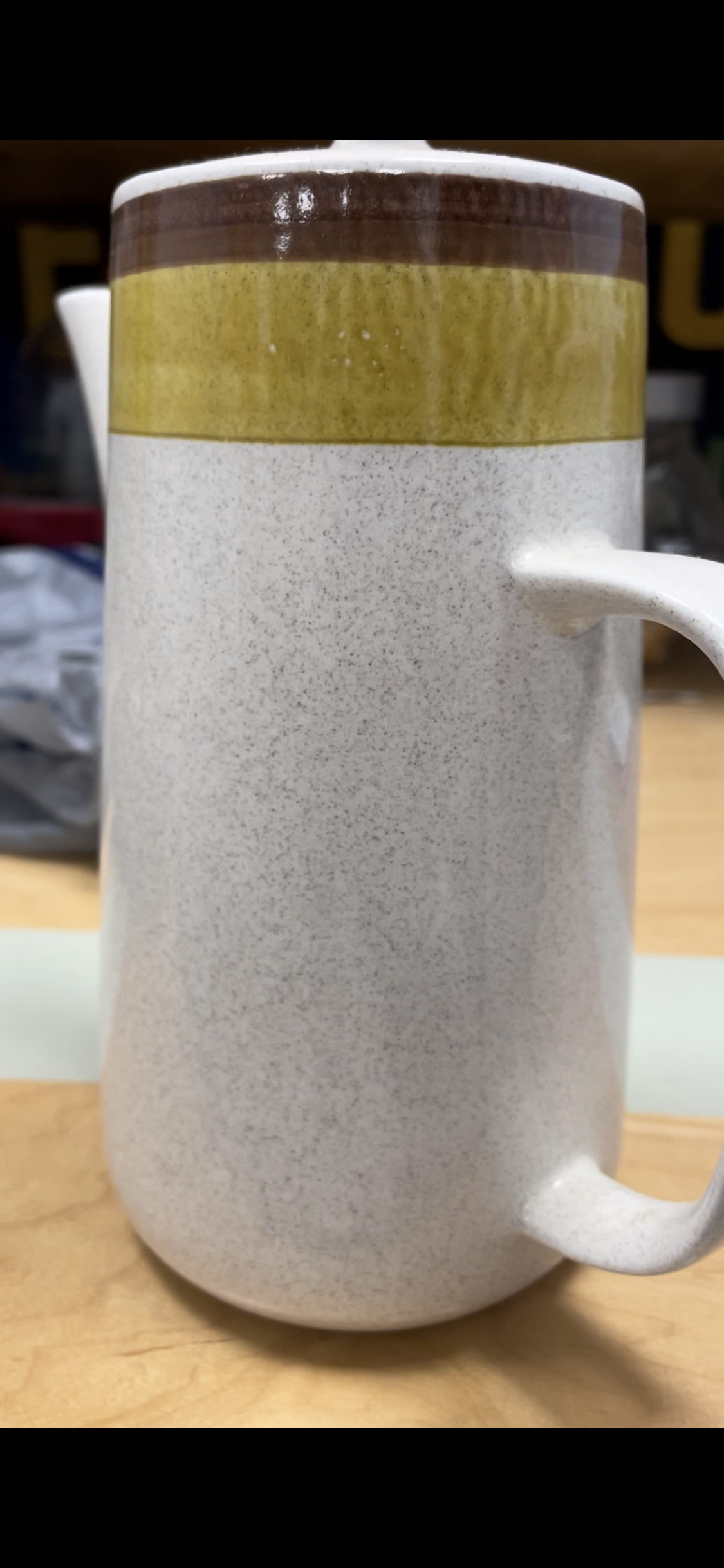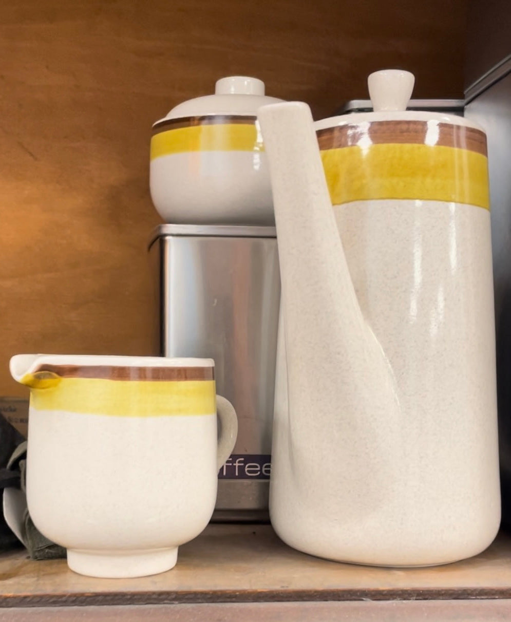 This cool 3-piece set consists of the pot with lid, creamer, and sugar bowl with lid. Speckled warm white glaze with brown and ochre accents around the top.