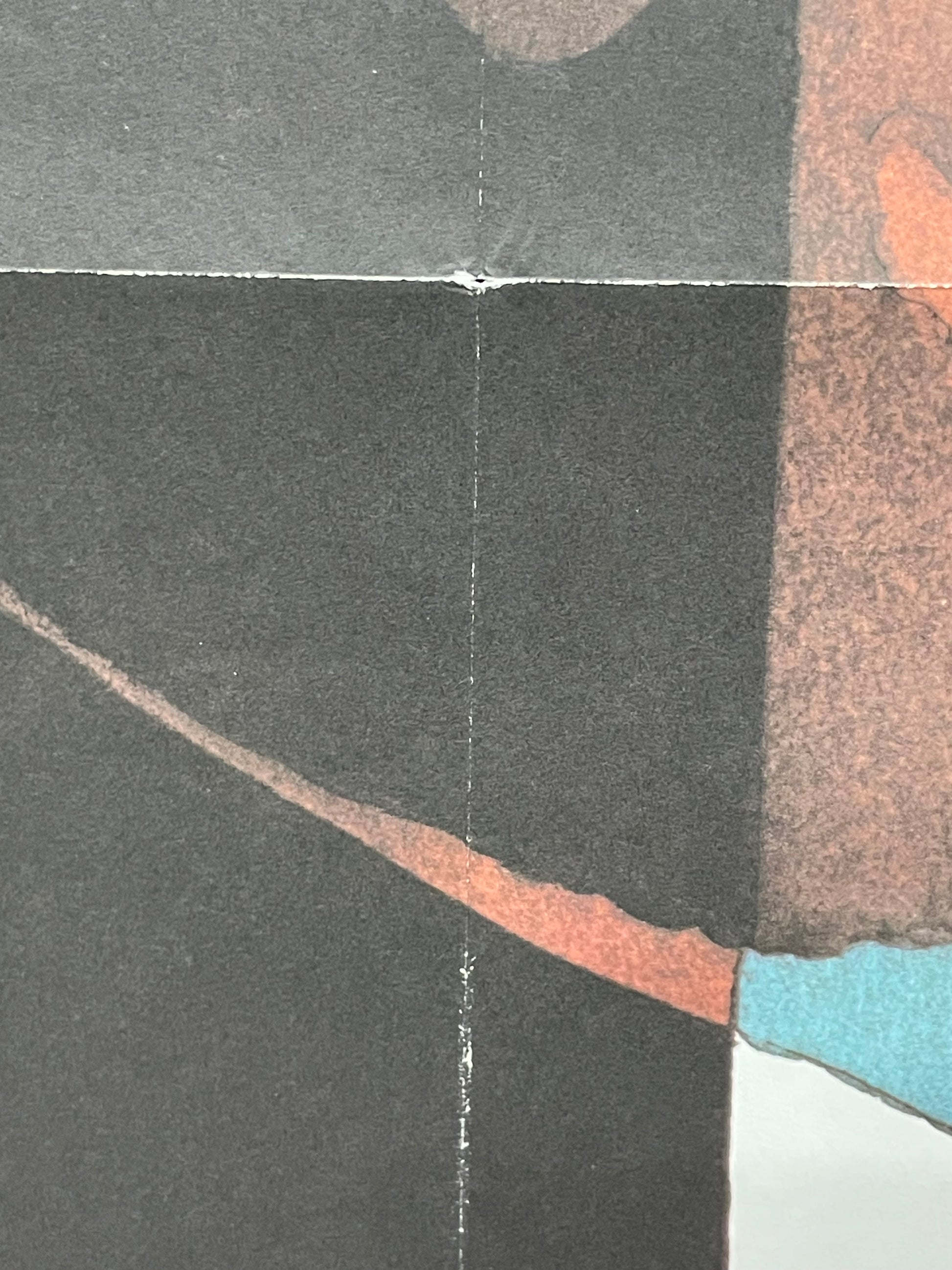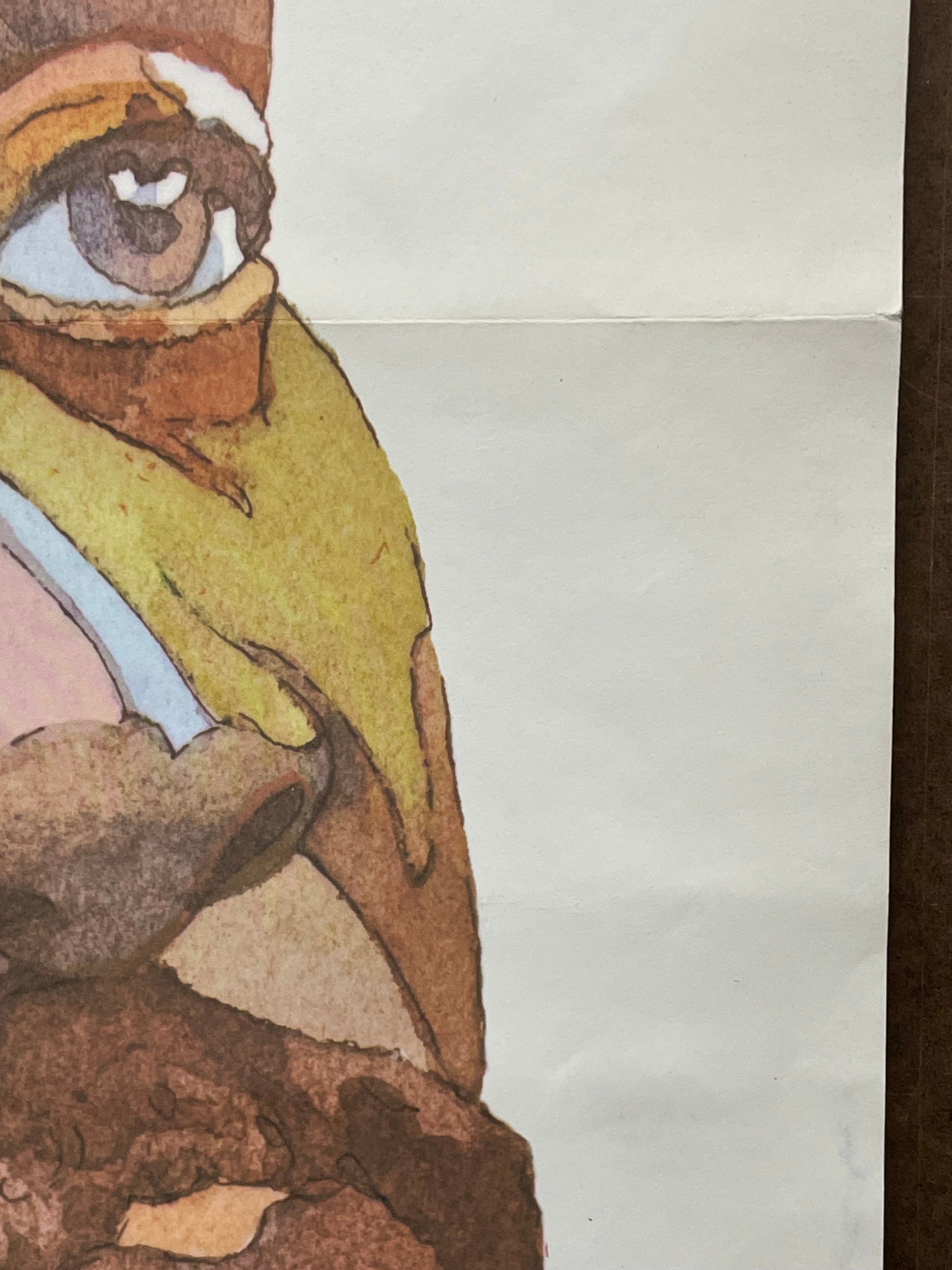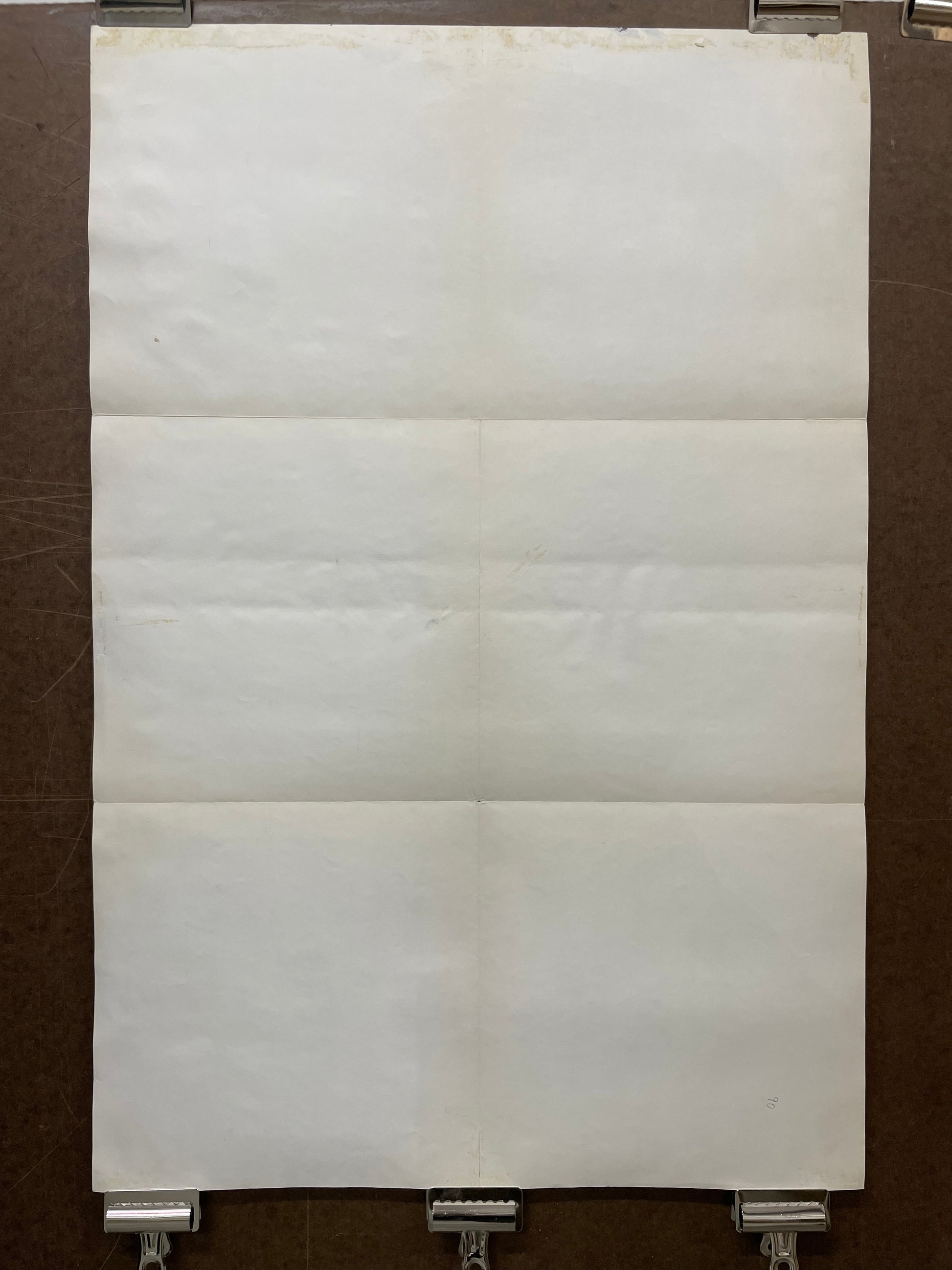 condition: Fair to good overall condition. Folded with color loss and toning along the folds. Adhesive residue along the back of the top edge. Minor paper loss and skinning at the top of the poster. Small tears at the top and lower right side.