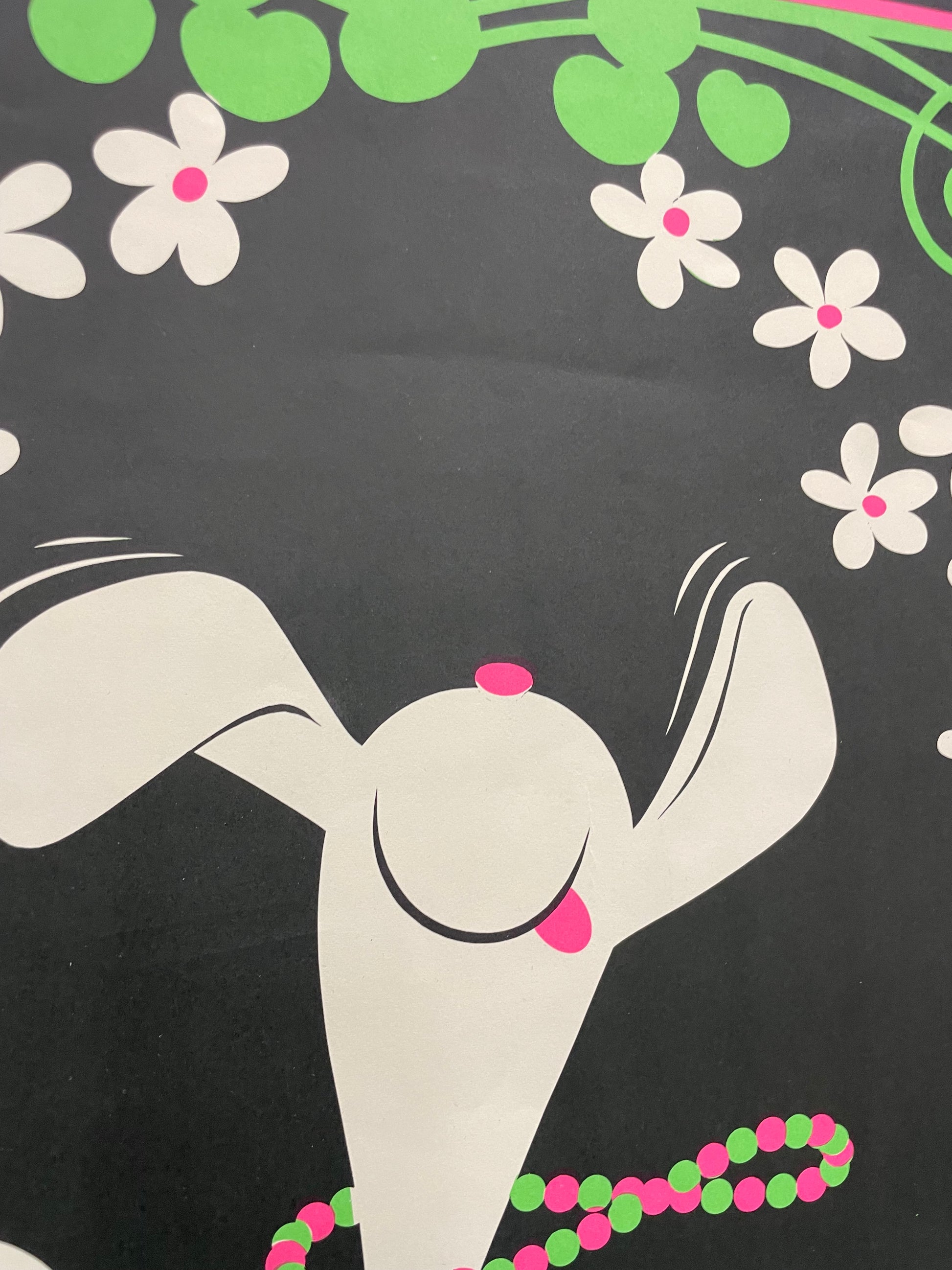 Image of a dancing Snoopy wearing a colorful beaded necklace, surrounded by flowers.