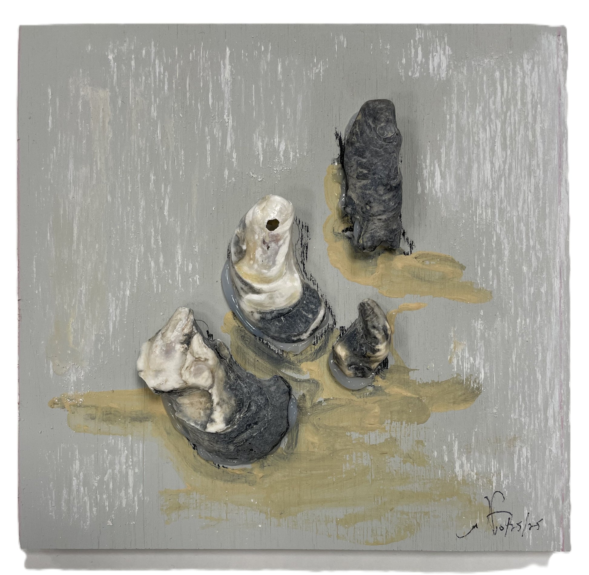 medium: Mixed media: shells, pencil, pastels, acrylic paint on wood panel.