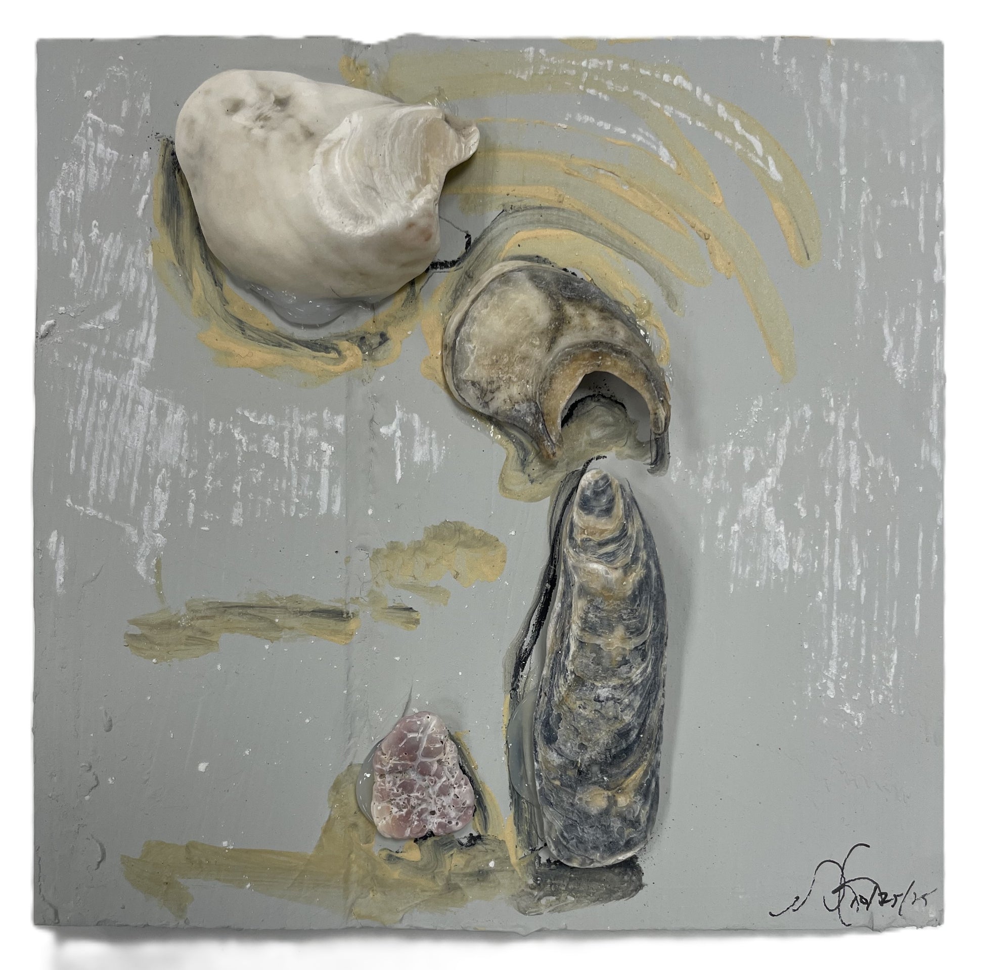 medium: Mixed media: shells, pencil, pastels, acrylic paint on wood panel.