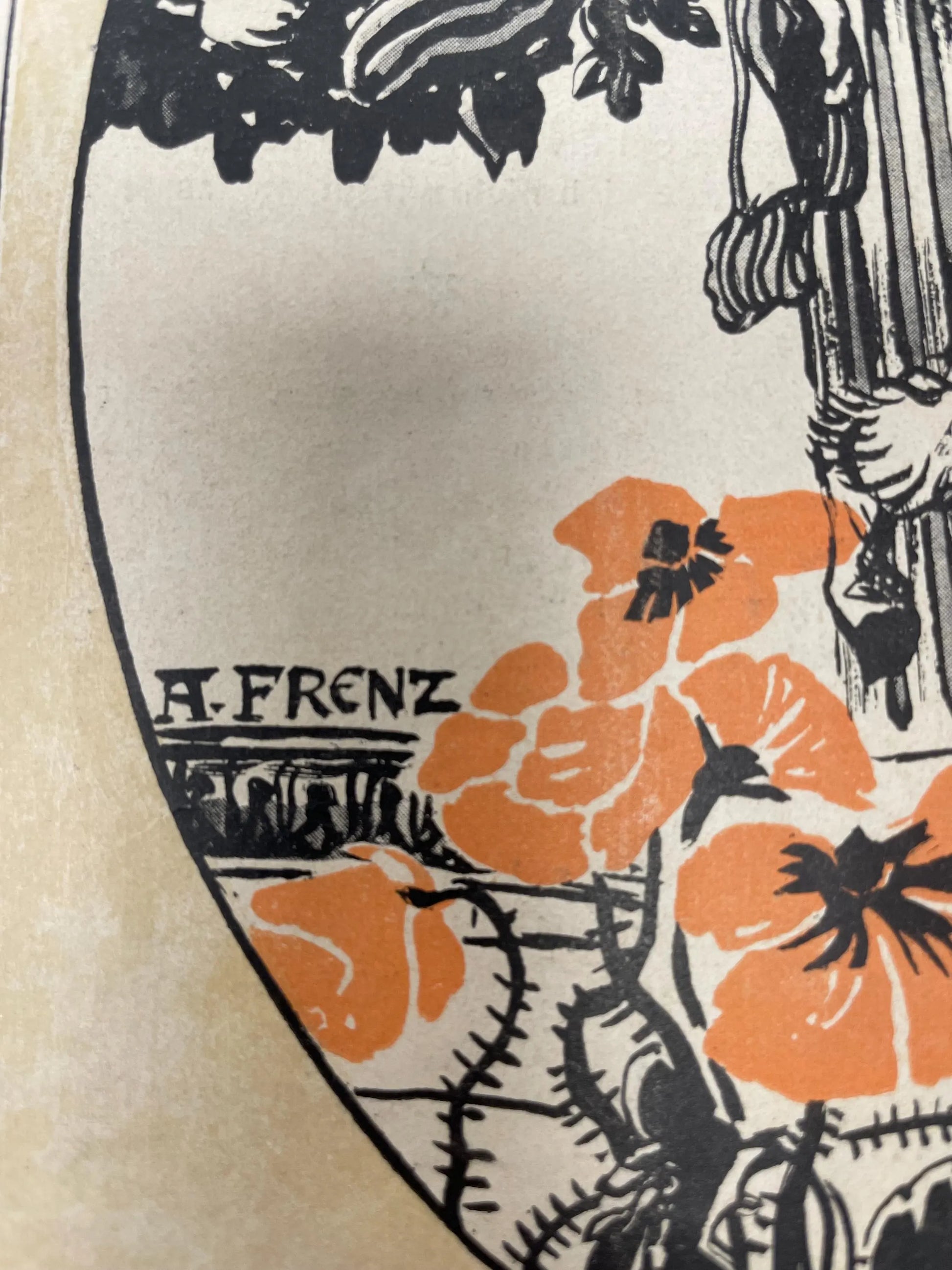 Original and period. Beautiful printing. A kid instantly recognizes his mother’s tomb as the goat skull appears within a warm glow and greets her baby goat. The two human-like figures look on lovingly at the reunion. Poppies in the foreground.