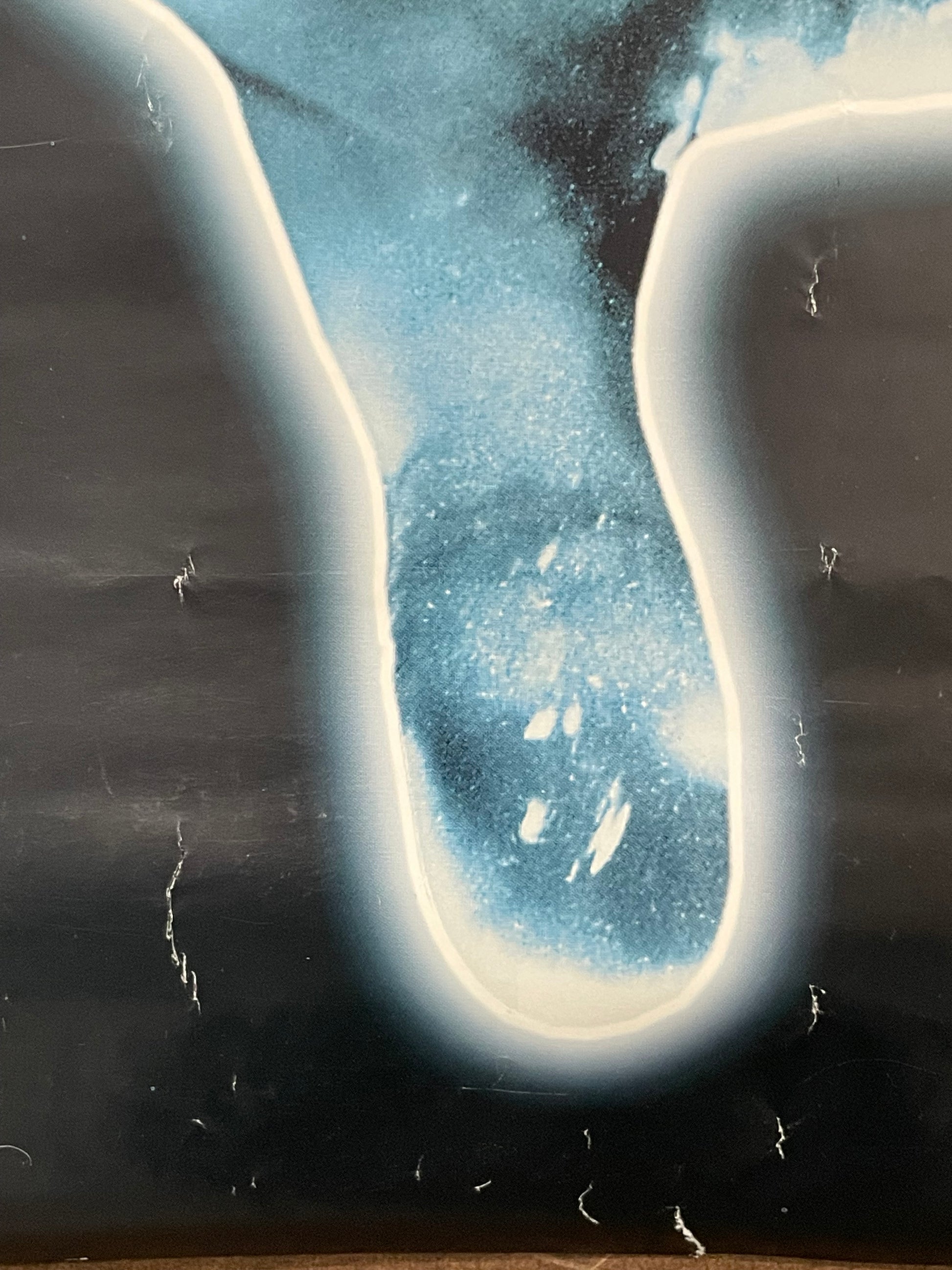 condition: Fair condition. Creases throughout with heavier vertical creases across the bottom of the poster. Edge tear on the right side; wear along the edges showing color loss. Surface wear; discoloration at the bottom left side of the poster. Rolled.
